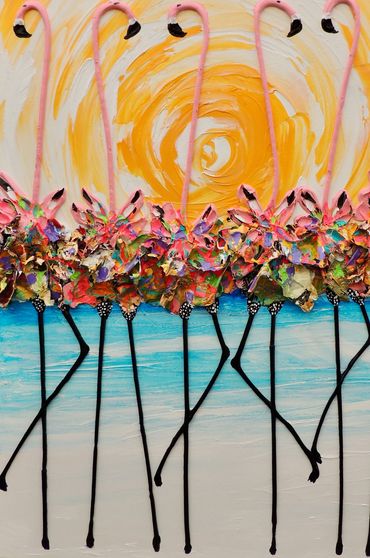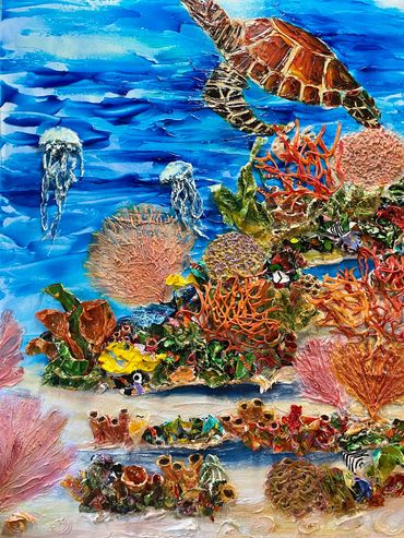 Of all the elements of design I am the most passionate about texture, then color. I am constantly searching for ways to bring my images up off the canvas. One of the ways I do this is by incorporating the use of “dried acrylic paint skins”. Acrylic paint skins can come from recycling the paint off my pallet or for larger needs, I mix, pour, and dry my own skins depending on the size and complexity of the project. Once the moisture has evaporated, the resulting skin is a pliable film of paint that allows me infinite possibilities to sculpt onto the canvas. It gives an amazing 3-D look that draws the viewer into the painting.